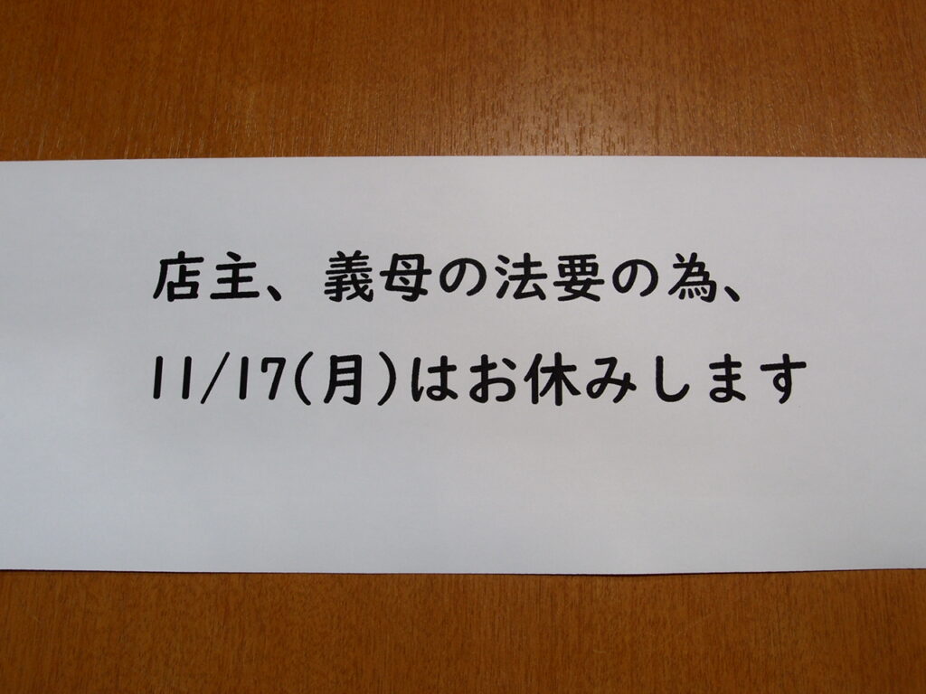 11/17(月)はお休みします 2025.11.15その他 店主、義母の法要の為、11/17(月)はお休みさせて頂きます。お客様にはご迷惑をお掛けしますが、よろしくお願いします。 OLYMPUS DIGITAL CAMERA FacebookXBluesky その他コメント: 0