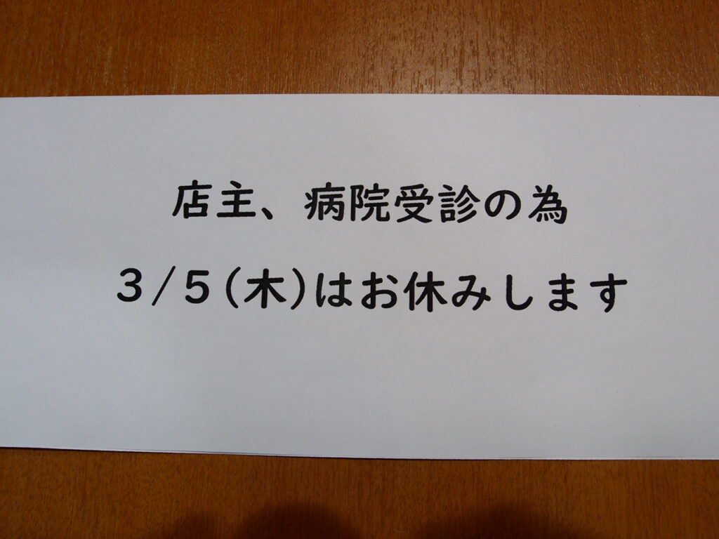 明日、3月5日(木)は病院受診の為、お休みさせていただきます。